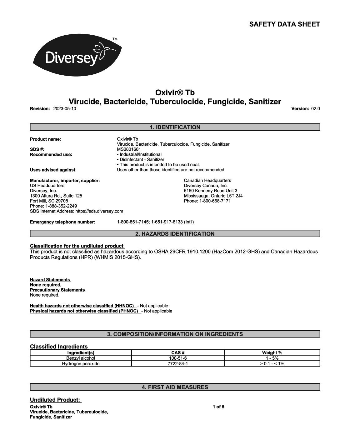 DIVERSEY Oxivir TB (Virucide, Bactericide, Tuberculocide, Fungicide, Sanitizer) QT